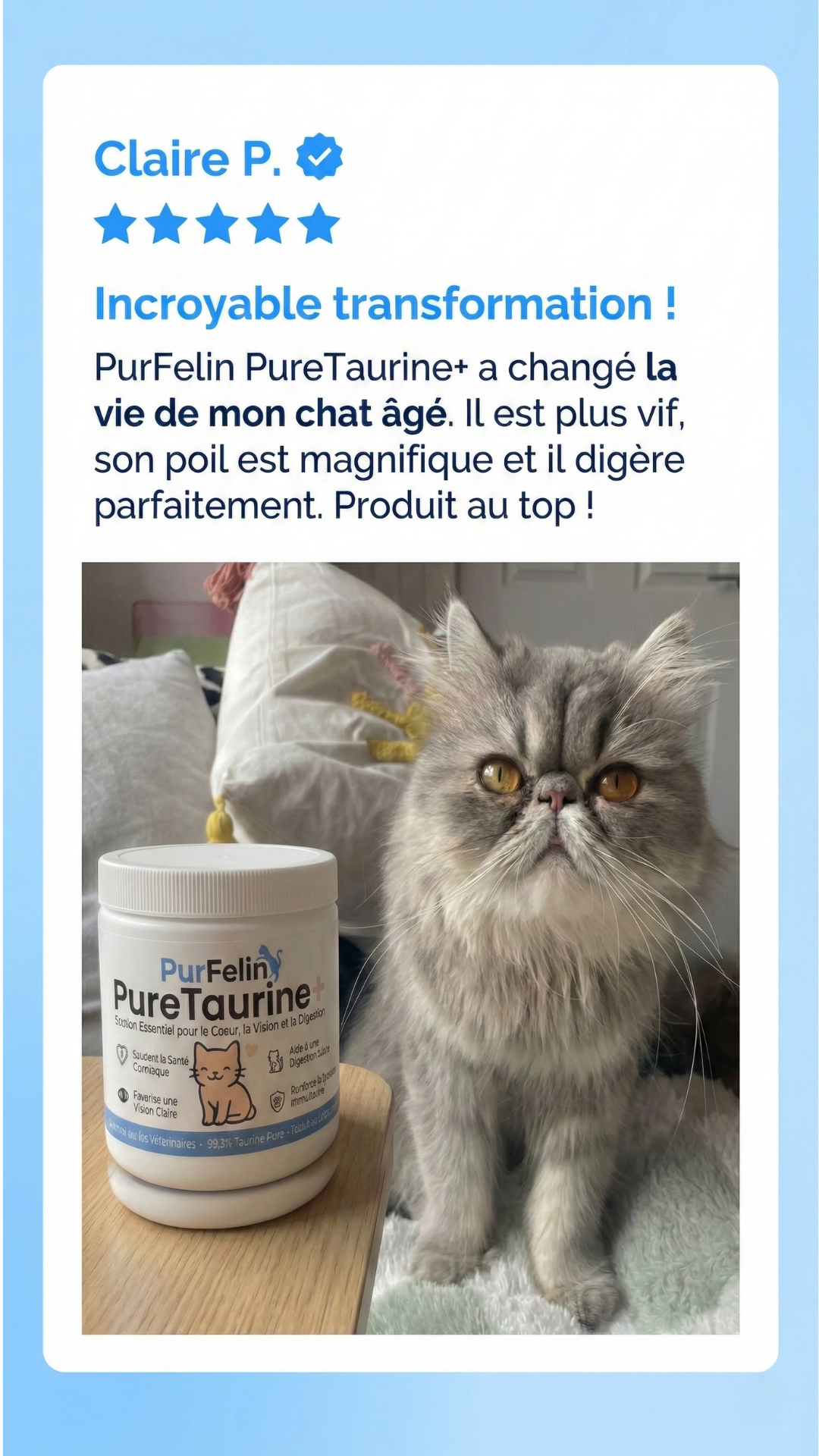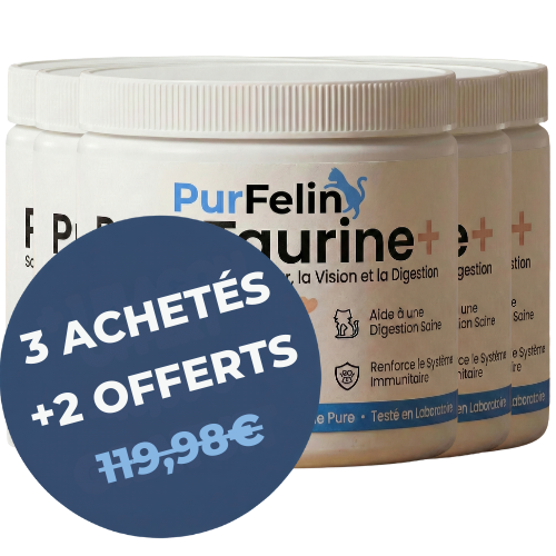 Même si vous n'avez pas remarqués de changement significatifs chez votre chat, les carences en taurine mettent parfois des mois à se manifester. Supplémenter dès maintenant permet d’agir en amont, avant que des déséquilibres plus graves ne s’installent.
