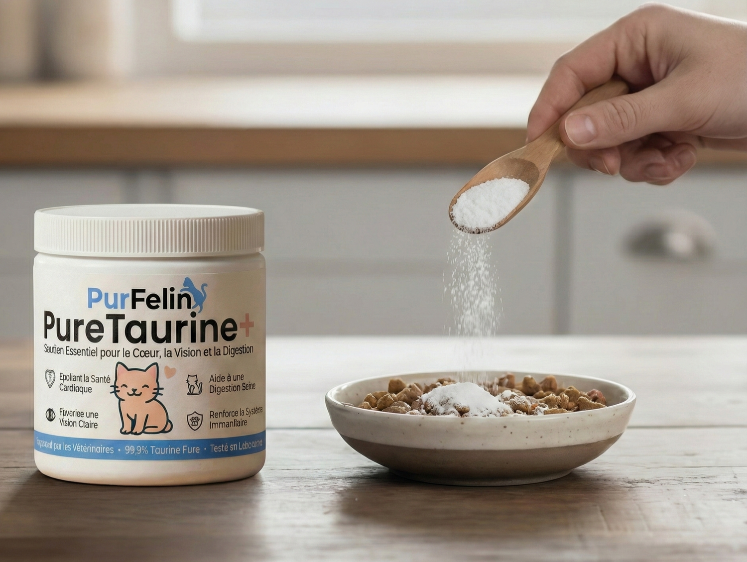 Une simple cuillère de PureTaurine+, mélangée à la nourriture de votre chat, apporte la taurine essentielle que son organisme ne peut pas produire seul.