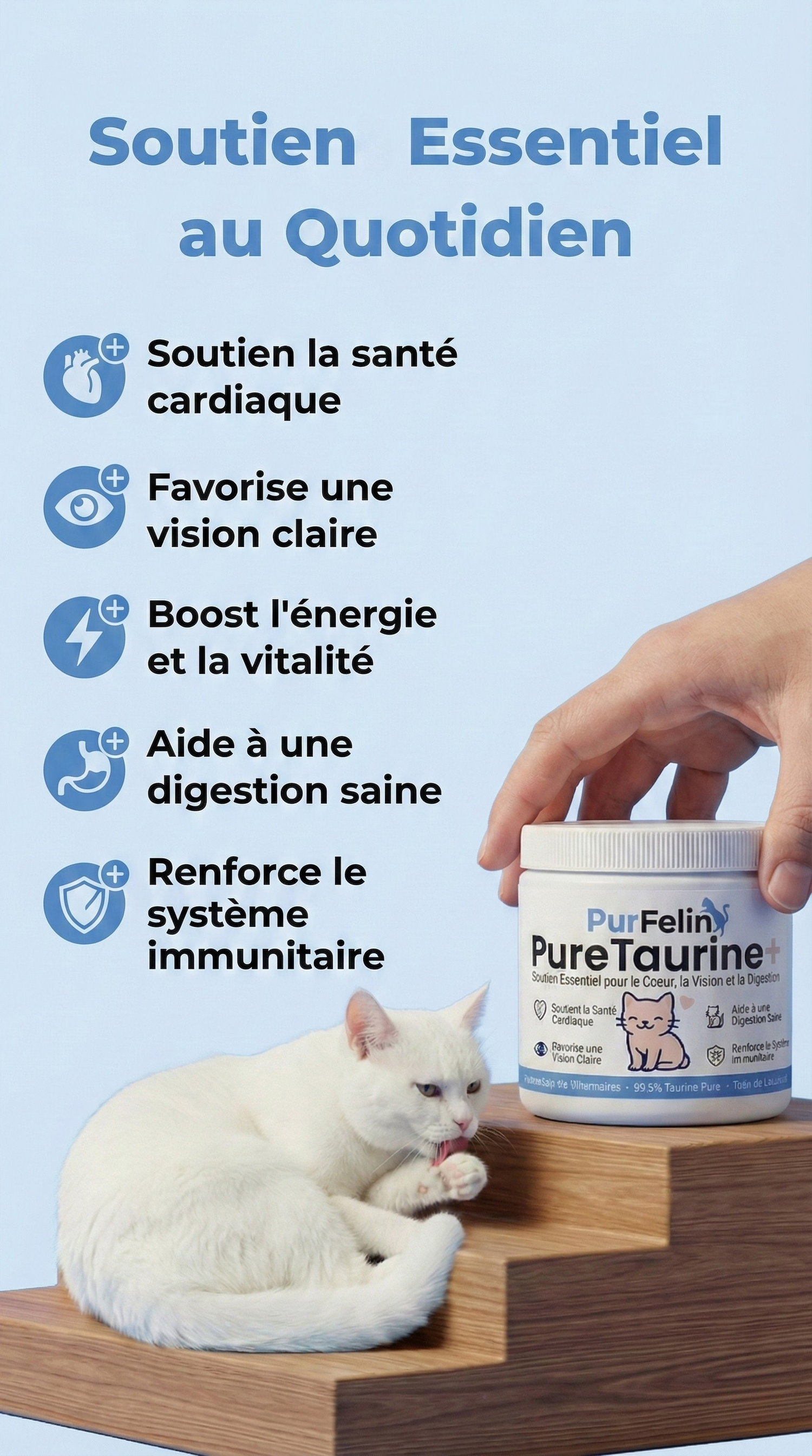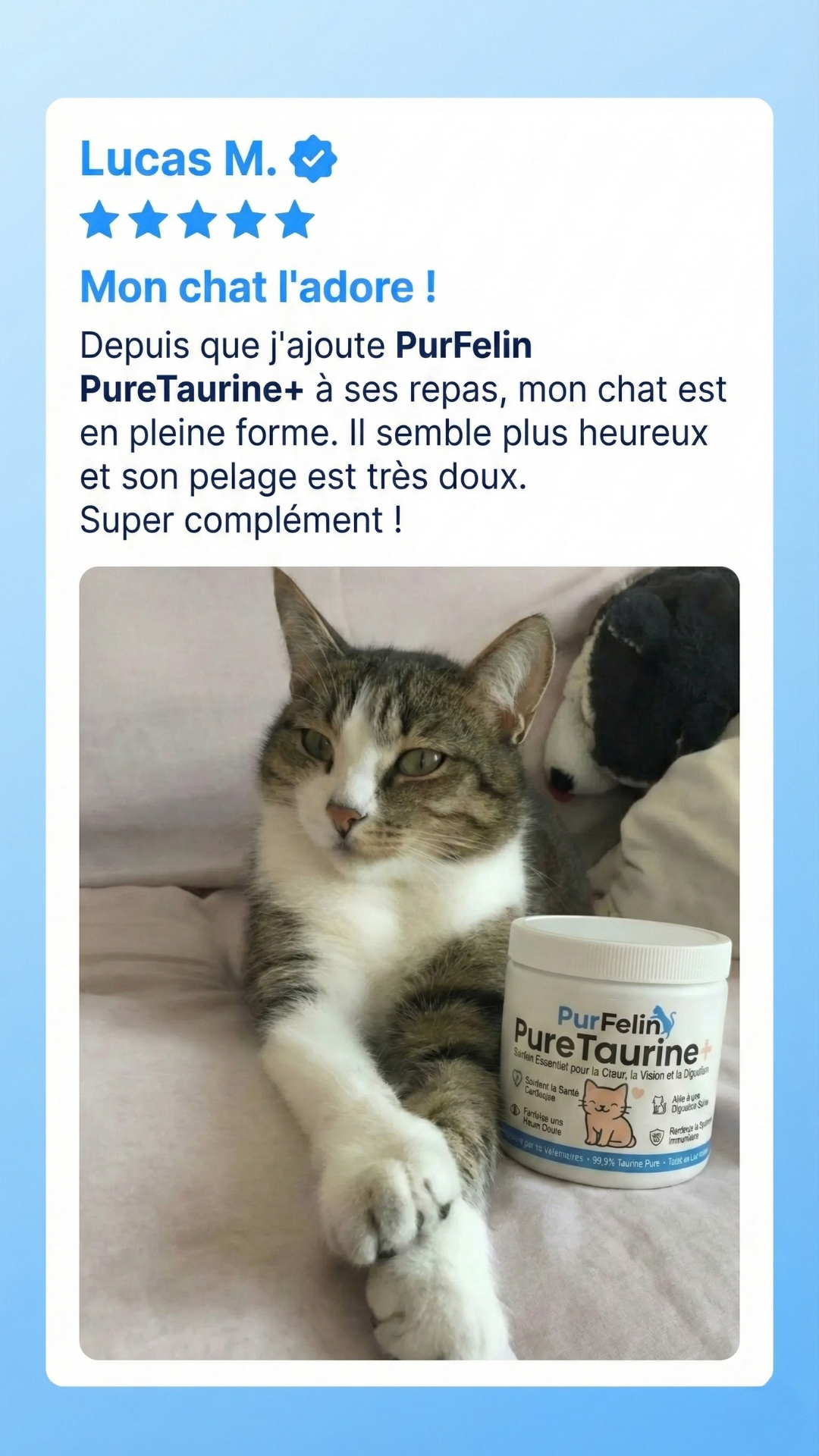 Même si vous n'avez pas remarqués de changement significatifs chez votre chat, les carences en taurine mettent parfois des mois à se manifester. Supplémenter dès maintenant permet d’agir en amont, avant que des déséquilibres plus graves ne s’installent.