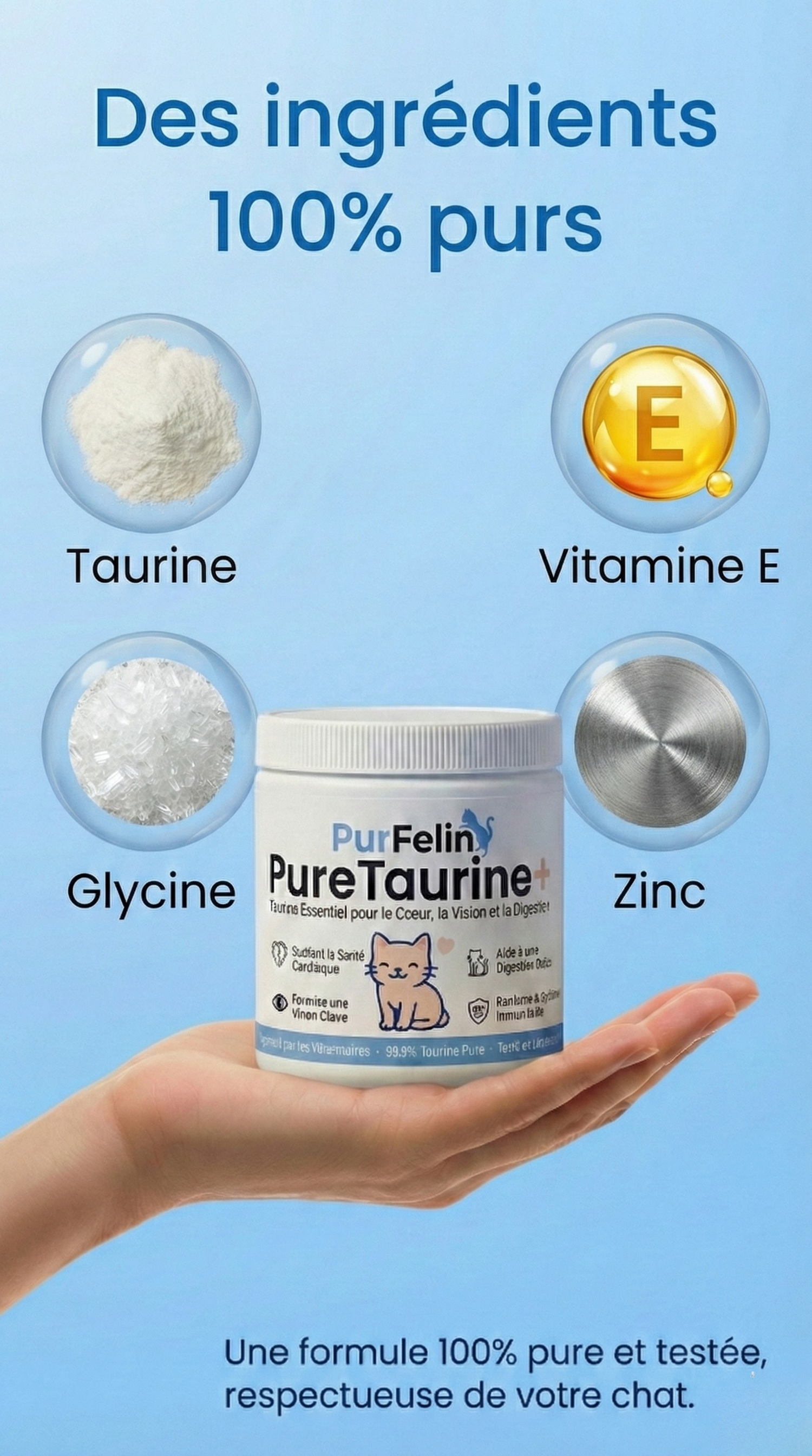Chaque lot de taurine PurFélin est testé par un organisme tiers afin de garantir sa pureté, sa concentration et l'absence de contaminants. Composée à 99,9 % de taurine de qualité pharmaceutique, elle est produite dans un établissement certifié BPF et ne contient ni agents de remplissage ni additifs.